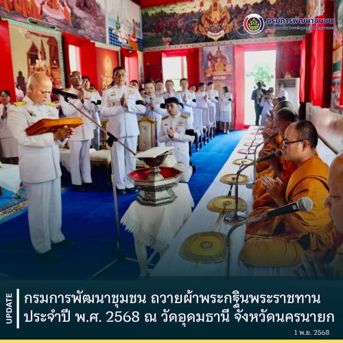 กรมการพัฒนาชุมชน ถวายผ้าพระกฐินพระราชทาน ประจำปี พ.ศ. 2568 ณ วัดอุดมธานี จังหวัดนครนายก