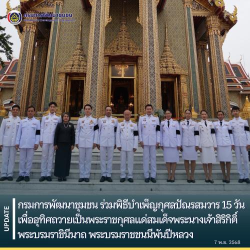 วันที่ 7 พฤศจิกายน 2568 เวลา 07.30 น. ณ วัดราชบพิธสถิตมหาสีมาราม กรุงเทพมหานคร นายสุรศักดิ์ อักษรกุล อธิบดีกรมการพัฒนาชุมชน นำคณะผู้บริหาร และข้าราชการกรมการพัฒนาชุมชน ร่วมพิธีบำเพ็ญกุศลปัณรสมวาร 15 วัน เพื่ออุทิศถวายเป็นพระราชกุศลแด่ สมเด็จพระนางเจ้าสิริกิติ์ พระบรมราชินีนาถ พระบรมราชชนนีพันปีหลวง โดยมีนายทรงศักดิ์ ทองศรี รมช.มหาดไทย เป็นประธานในพิธี พร้อมนี้ ผู้บริหารกรม หัวหน้าหน่วยงานรัฐวิสาหกิจ ข้าราชการ เจ้าหน้าที่ในสังกัดกระทรวงมหาดไทย และสมาคมแม่บ้านมหาดไทย เข้าร่วมแสดงความจงรักภักดีและสำนึกในพระมหากรุณาธิคุณอย่างหาที่สุดมิได้อย่างพร้อมเพรียง
