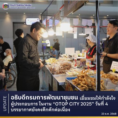 วันนี้ (23 ธันวาคม 2568) ณ อาคารชาเลนเจอร์ 1–3 อิมแพ็ค เมืองทองธานี จังหวัดนนทบุรี นายสยาม ศิริมงคล อธิบดีกรมการพัฒนาชุมชน ได้เดินเยี่ยมชมและให้กำลังใจผู้ประกอบการ OTOP ภายในงาน “OTOP CITY 2025” ซึ่งตลอดทั้งวันบรรยากาศยังคงคึกคักต่อเนื่อง มีประชาชนให้ความสนใจเดินทางมาชมและเลือกซื้อผลิตภัณฑ์จากทั่วประเทศเป็นจำนวนมาก