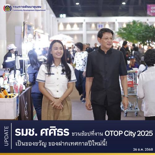 นางสาว ศศิธร กิตติธรกุล รัฐมนตรีช่วยว่าการกระทรวงมหาดไทย พร้อมด้วย นายสยาม ศิริมงคล อธิบดีกรมการพัฒนาชุมชน เดินเยี่ยมชมและให้กำลังใจผู้ประกอบการใน โซนของใช้ ของตกแต่ง และของที่ระลึก OTOP ภายในงาน OTOP CITY 2025 พร้อมเชิญชวนประชาชนและนักท่องเที่ยว ร่วมช้อป ชิม ชิล ในเทศกาลปีใหม่ ที่งาน OTOP City 2025 ณ อิมแพ็คชาเลนเจอร์ 1-3 เมืองทองธานี ซึ่งจัดถึงวันที่ 28 ธันวาคม 2568 นี้