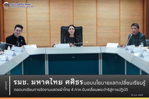 วันที่ 22 มกราคม 2569 เวลา 09.00 น. ณ ห้องประชุมเสียงแคน ศาลากลางจังหวัดขอนแก่น นางสาวศศิธร กิตติธรกุล รัฐมนตรีช่วยว่าการกระทรวงมหาดไทย เป็นประธานรับมอบนโยบายแลกเปลี่ยนเรียนรู้ ถอดบทเรียนการจัดงานแสดงผ้าไทย 4 ภาค ณ จังหวัดขอนแก่น และกำหนดแนวทางการน้อมนำพระดำริของสมเด็จพระเจ้าลูกเธอ เจ้าฟ้าสิริวัณณวรี นารีรัตนราชกัญญา ที่ให้กับผู้ประกอบการผ้าไทยไปสู่การปฏิบัติ โดยมีนายสยาม ศิริมงคล อธิบดีกรมการพัฒนาชุมชน คณะผู้บริหารกรมการพัฒนาชุมชน พัฒนาการจังหวัดขอนแก่น พัฒนาการอำเภอ และเจ้าหน้าที่พัฒนาชุมชน เข้าร่วมเพื่อกำหนดทิศทางการทำงานปีงบประมาณ พ.ศ. 2569 มุ่งยกระดับคุณภาพชีวิตประชาชนให้สอดคล้องกับการเปลี่ยนแปลงของสังคม และขับเคลื่อนการพัฒนาประเทศจากฐานรากอย่างเป็นรูปธรรม โดยมี นายขจรเกียรติ รักพานิชมณี ผู้ว่าราชการจังหวัดขอนแก่น ให้การต้อนรับ