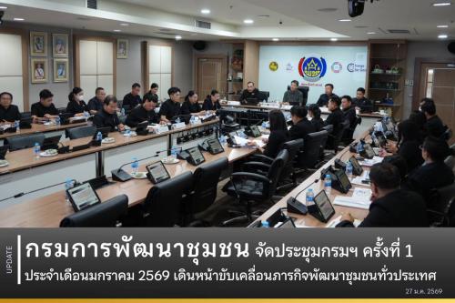 วันที่ 27 มกราคม 2569 เวลา 10.30 น. ณ ห้องประชุม 5001 ชั้น 5 กรมการพัฒนาชุมชน นายสยาม ศิริมงคล อธิบดีกรมการพัฒนาชุมชน พร้อมด้วยรองอธิบดีกรมการพัฒนาชุมชน คณะผู้บริหาร พัฒนาการจังหวัด และเจ้าหน้าที่ที่เกี่ยวข้อง เข้าร่วมประชุมกรมการพัฒนาชุมชน ครั้งที่ 1/2569 ทั้งในรูปแบบ Onsite และ Online ผ่านระบบ Video Conference (VCS) เพื่อรับทราบนโยบาย แนวทางการดำเนินงาน และเตรียมความพร้อมในการขับเคลื่อนภารกิจด้านการพัฒนาชุมชนให้เกิดผลเป็นรูปธรรมในทุกพื้นที่