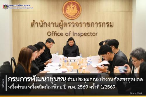 วันพุธที่ 28 มกราคม 2569 เวลา 11.00 น. นายสยาม ศิริมงคล อธิบดีกรมการพัฒนาชุมชน เข้าร่วมการประชุมคณะทำงานดำเนินการคัดสรรสุดยอดหนึ่งตำบล หนึ่งผลิตภัณฑ์ไทย ปี พ.ศ. 2569 (OTOP Product Champion : OPC) ครั้งที่ 1/2569 ณ ห้องประชุม 304 กรมโยธาธิการและผังเมือง เพื่อขับเคลื่อนการดำเนินงานคัดสรร สุดยอดหนึ่งตำบล หนึ่งผลิตภัณฑ์ไทยในปีนี้ ให้เป็นไปอย่างมีประสิทธิภาพและเป็นมาตรฐาน โดยการประชุมฯ ในครั้งนี้ ได้รับเกียรติจากนายอรรษิษฐ์ สัมพันธรัตน์ ปลัดกระทรวงมหาดไทย เป็นประธานคณะทำงานในการประชุม พร้อมด้วยคณะทำงานฯ เข้าร่วมทั้งในที่ประชุมและผ่านระบบ Zoom Meeting