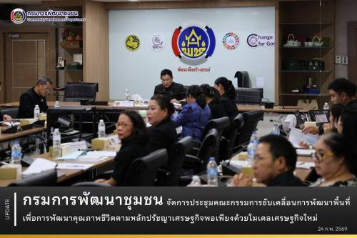 วันที่ 24 กุมภาพันธ์ 2569 เวลา 13.30 น. ณ ห้องประชุม 5001 ชั้น 5 กรมการพัฒนาชุมชน นายสามารถ สุวรรณมณี รองอธิบดีกรมการพัฒนาชุมชน เป็นประธานการประชุมคณะกรรมการขับเคลื่อนการพัฒนาพื้นที่เพื่อการพัฒนาคุณภาพชีวิตตามหลักปรัชญาเศรษฐกิจพอเพียงด้วยโมเดลเศรษฐกิจใหม่ ครั้งที่ 1/2569 โดยมีคณะกรรมการและเจ้าหน้าที่ที่เกี่ยวข้องเข้าร่วมประชุมฯ ทั้งในรูปแบบ Onsite และ Online ผ่านระบบ Cisco Webex Meetings เพื่อติดตามความก้าวหน้าการดำเนินงานในพื้นที่เป้าหมาย