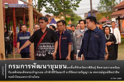 วันที่ 12 มีนาคม 2569 เวลา 15.00 น. ณ สหกรณ์ศูนย์ศิลปาชีพทอผ้าไหมแพรวา บ้านโพน ตำบลบ้านโพน อำเภอคำม่วง จังหวัดกาฬสินธุ์ นายสยาม ศิริมงคล อธิบดีกรมการพัฒนาชุมชน พร้อมด้วย คณะผู้บริหารกรมการพัฒนาชุมชน นายธนันท์รัฐ ธนเสฏฐการย์ ผู้เชี่ยวชาญด้านผ้าไทยและที่ปรึกษาโครงการผ้าไทยใส่ให้สนุก พร้อมทีมที่ปรึกษาโครงการฯ และเจ้าหน้าที่พัฒนาชุมชน ลงพื้นที่ติดตามความพร้อมและเยี่ยมเยียนให้กำลังใจผู้ประกอบการผ้าไหมแพรวาและงานหัตถกรรม ในการเตรียมการรับเสด็จสมเด็จพระเจ้าลูกเธอ เจ้าฟ้าสิริวัณณวรี นารีรัตนราชกัญญา เนื่องในโอกาสเสด็จทอดพระเนตรนิทรรศการและการจัดแสดงผลงานภูมิปัญญาผ้าไทยและงานหัตถกรรมชุมชน