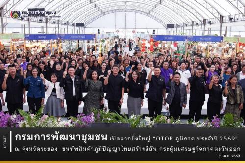 วันที่ 2 เมษายน 2569 เวลา 13.30 น. ณ ศาลากลางจังหวัดระยอง นายสยาม ศิริมงคล อธิบดีกรมการพัฒนาชุมชน เป็นประธานในพิธีเปิดงาน “OTOP ภูมิภาค ประจำปี 2569” จุดดำเนินการที่ 2 ณ จังหวัดระยอง ภายใต้แนวคิด “สีสันถิ่นเรา เรื่องเล่าแห่งภูมิปัญญา” โดยมี นางสาวสลารีวรรณ ทัพทวี รองผู้ว่าราชการจังหวัดระยอง กล่าวให้การต้อนรับ พร้อมนี้รองอธิบดีกรมการพัฒนาชุมชน ผู้ตรวจราชการกรม ผู้บริหารกรมการพัฒนาชุมชน นางชนินันท์ วงศ์ไตรรัตน์ นายกเหล่ากาชาดจังหวัดระยอง พร้อมด้วยหัวหน้าส่วนราชการจังหวัด เจ้าหน้าที่กรมการพัฒนาชุมชน และพี่น้องประชาชนชาวระยองเข้าร่วมงานอย่างคึกคัก