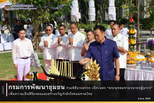 ในการนี้ นายสยาม ศิริมงคล อธิบดีกรมการพัฒนาชุมชน พร้อมด้วยรองอธิบดีกรมการพัฒนาชุมชน คณะผู้บริหาร และเจ้าหน้าที่กรมการพัฒนาชุมชน เข้าร่วมพิธีในครั้งนี้ด้วย เพื่อความเป็นสิริมงคลและเสริมสร้างขวัญกำลังใจในการปฏิบัติราชการ โดยร่วมรับชมพิธีเบิกเนตรพระพุทธมหานวนาคปฏิมากร และพิธีเจริญพระพุทธมนต์เพื่อความเป็นสวัสดิมงคลแก่องค์กรและบุคลากรในสังกัดกระทรวงมหาดไทย