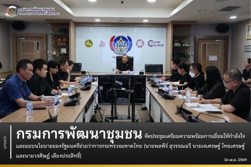 วันที่ 16 เม.ย. 69 เวลา 13.30 น. ณ ห้องประชุม 5001 กรมการพัฒนาชุมชน นายวรงค์ แสงเมือง รองอธิบดีกรมการพัฒนาชุมชน เป็นประธานการประชุมเตรียมความพร้อมรับการเยี่ยมให้กำลังใจและมอบนโยบายของรัฐมนตรีช่วยว่าการกระทรวงมหาดไทย (นายพลพีร์ สุวรรณฉวี นายเจเศรษฐ์ ไทยเศรษฐ์ และนายวรศิษฎ์ เลียงประสิทธิ์) ซึ่งมีกำหนดการเดินทางมาตรวจเยี่ยมฯ ที่กรมการพัฒนาชุมชน ในวันที่ 20 เม.ย. 69 เวลา 15.00 น. พร้อมนี้ได้มีคณะผู้บริหารกรมการพัฒนาชุมชน และเจ้าหน้าที่พัฒนาชุมชนที่เกี่ยวข้องเข้าร่วมประชุมเตรียมความพร้อมฯ โดยพร้อมเพรียง