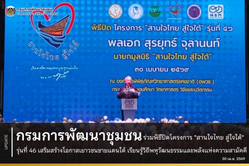 วันที่ 30 เมษายน 2569 เวลา 10.30 น. ณ ห้องแสงเดือน แสงเทียน ชั้น 2 อาคารพิพิธภัณฑ์พระราม 9 องค์การพิพิธภัณฑ์วิทยาศาสตร์แห่งชาติ จังหวัดปทุมธานี นายวรงค์ แสงเมือง รองอธิบดีกรมการพัฒนาชุมชน เข้าร่วมพิธีปิดโครงการ "สานใจไทย สู่ใจใต้" รุ่นที่ 46 โดยได้รับเกียรติจาก พลเอก สุรยุทธ์ จุลานนท์ นายกมูลนิธิ "สานใจไทย สู่ใจใต้" เป็นประธานในพิธี ในการนี้ นายอรรษิษฐ์ สัมพันธรัตน์ ปลัดกระทรวงมหาดไทย พร้อมด้วยผู้บริหารระดับกรมของกระทรวงมหาดไทย ร่วมแสดงความยินดีและมอบเกียรติบัตรแก่เยาวชนจากจังหวัดชายแดนภาคใต้ที่สำเร็จการเข้าร่วมโครงการฯ